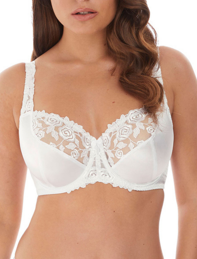 The Fantasie Belle collection in White features an Underwire Full Cup Bra, an Underwire Full Cup Bra for larger sizes and a Underwire Balcony Bra with matching Panties.The Fantasie Belle Balcony Bra creates a chic and sophisticated piece with three sections built up cups with a satin smooth fabric adorned with White Austrian floral embroidery across the tulle of the cups and around the adjustable straps finished with cute bows. The Belle Balcony Bra has a cradle construction for a better uplift and support with a plunging neckline for a glamourous cleavage look. The Balcony Bra provides a three row 2 hook and eye back fastener with wider straps for a more comfortable hold.