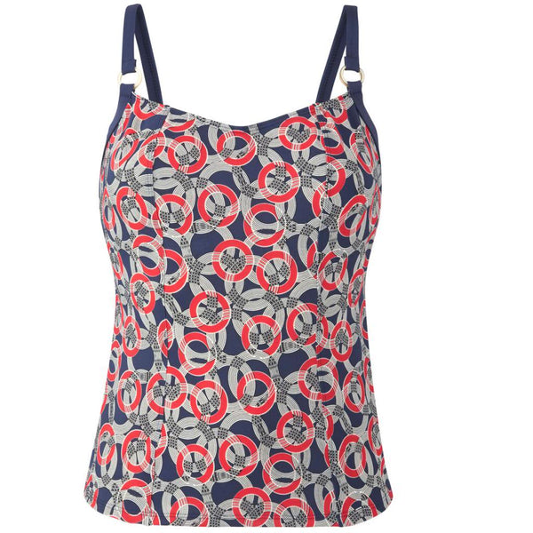 Con un impresionante estampado de temática náutica en rojo, azul y gris claro, el top tankini Panache N...