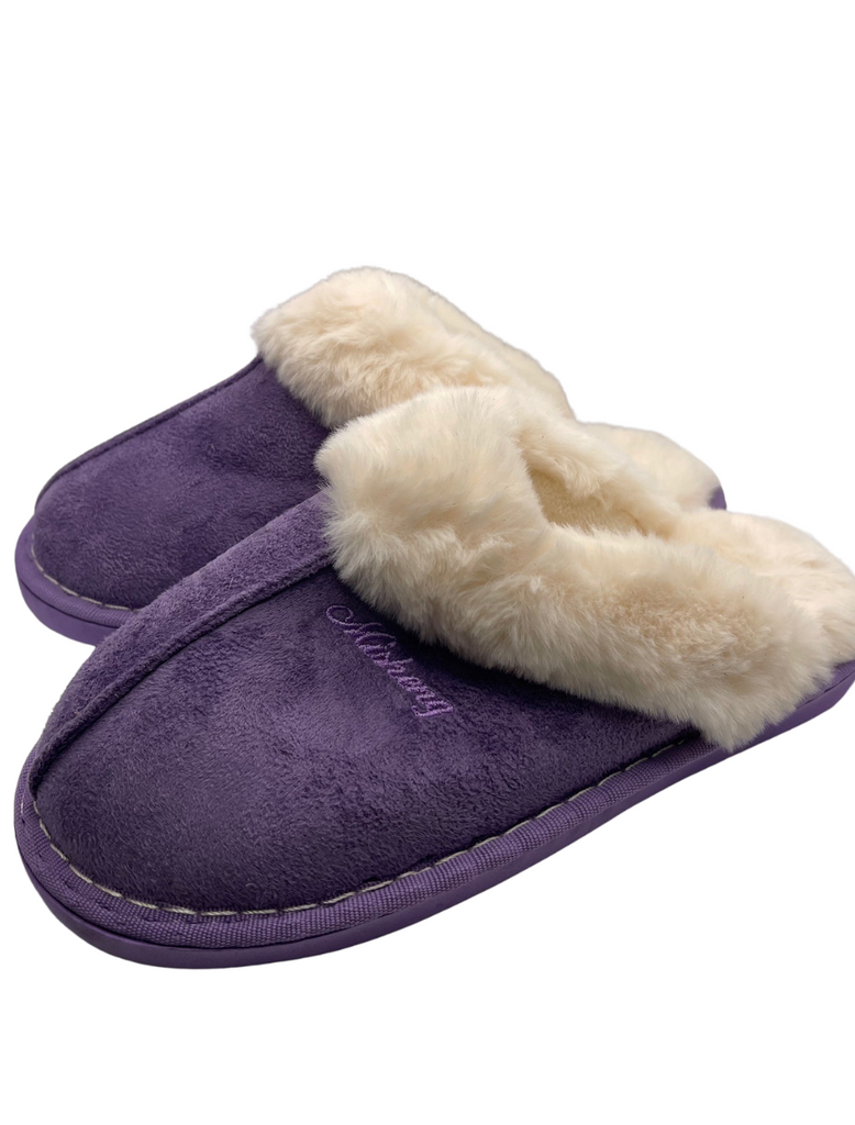 Las pantuflas Lila de piel de oveja sintética para mujer de Bras & Honey, color morado, están confeccionadas con un suave forro de piel sintética que se extiende hasta el borde exterior de las pantuflas. Estas zapatillas han sido confeccionadas para mantener tus pies calentitos en las noches frías. Con diseño deslizante y base de goma gruesa.