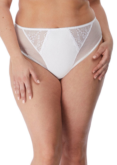 Las bragas Elomi Charley en blanco tienen un diseño elegante, estas bragas son perfectas todos los días de la semana. El diseño presenta una hermosa tela de malla de diamantes con detalles de encaje elástico que tiene un delicado bordado floral, el encaje en la parte posterior de las bragas tiene un detalle de encaje completo y una característica de corte. Las bragas tienen cintura media y paneles laterales más anchos para una cobertura adicional de la cadera y una apariencia modesta. Los paneles laterales son semitransparentes para darle un toque moderno, perfecto para cualquier ocasión.
