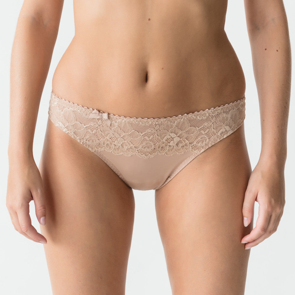 Tanga PrimaDonna Couture, color crema. Estos calzoncillos son suaves como la mantequilla y sedosos en la piel, lo que los hace súper cómodos y perfectos para el uso diario. Estos calzoncillos se estirarán para adaptarse a tus curvas únicas y ofrecerán una cobertura mínima en la espalda para darle un toque sexy. Hay encaje elástico floral en la parte superior de los calzoncillos y un lindo lazo pequeño descentrado para rematar todo.