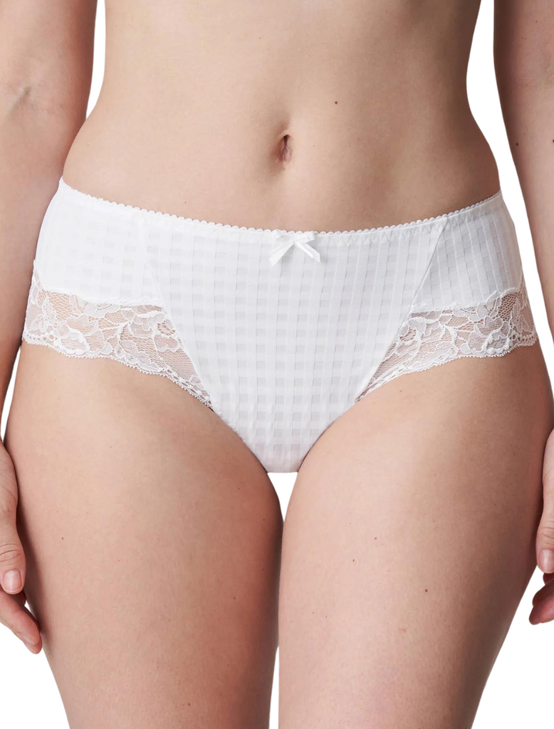 Los pantalones cortos PrimaDonna Madison, blancos, son la mejor opción para una dama modesta y elegante. Estos calzoncillos están confeccionados con encaje suave y elástico para ayudar a que se ajusten a tus curvas perfectas. Con una base con patrón de gofre, estos calzoncillos tienen magníficos paneles de encaje floral en la parte delantera de las caderas. Estos calzoncillos seguramente llamarán la atención en este blanco puro y frío.