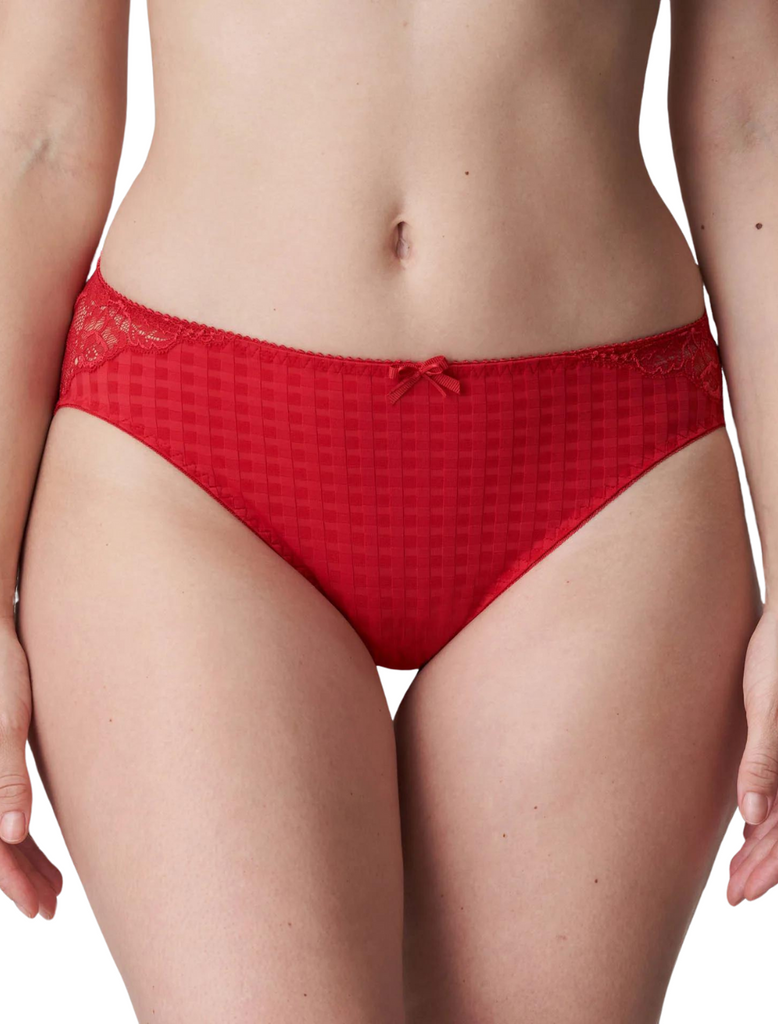 Los calzoncillos PrimaDonna Madison Rio, Scarlet, tienen un corte alto en las caderas y están diseñados para complementar cada curva. Estos calzoncillos están hechos para adaptarse perfectamente a tu cuerpo y estirarse mientras te mueves. Estos calzoncillos tienen una base con patrón de gofre y ventanas de encaje en la parte delantera de las caderas para darle un toque sexy. Estos calzoncillos son ultracómodos y duraderos y te harán sentir seguro y en la cima del mundo.