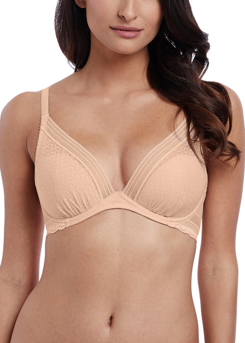 El sujetador Wacoal Aphrodite Plunge en Powder es un sujetador perfecto para una figura más completa con un diseño de lujo que adorarás, este sujetador presenta un frente central bajo y un ápice alto que brinda un escote profundo y un ala trasera de encaje elástico forrada con malla elástica para apoyo adicional.