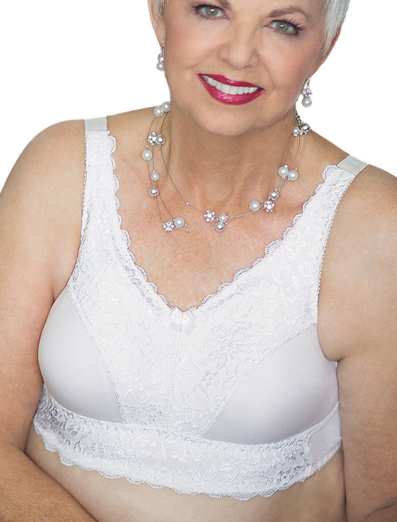 The American Breast Care 503 Embrace Bra, Optic White is a bright and beautiful bra for the modest lady. This bra has no wires an soft cups for maximum comfort, while still keeping you as secure as possible. This bra is lightweight and soft to the touch with cotton cups and band. There is lace detailing along the band and straps as well as the top of the cups for a beautiful fashionable touch.