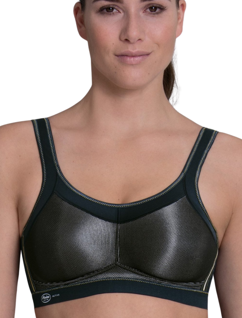 The Anita Momentum Free Sports Bra in Black is awesome when you are looking for a gym buddy for your high energy workout, Using compression to reduce bounce and protect your breast tissue you get ultimate control back to enjoy your favorite activity. The bra remains stable with the large elastic underband that reduces skin irritation and keeps you secure. The color has a solid black frame and straps with a shiny silver/black cups that give the bra a unique look.