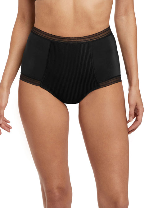 The Fantasie Fusion High Waist Panty in Black, is timeless and sophisticated in the design and the look with the soft handle stripped jacquard. The Fusion Brief has a deep flat elastic at the waist and front leg for a smooth finish and a gather at the centre back seam for shaping. The Fusion briefs offer moderate rear coverage with a mid rise.