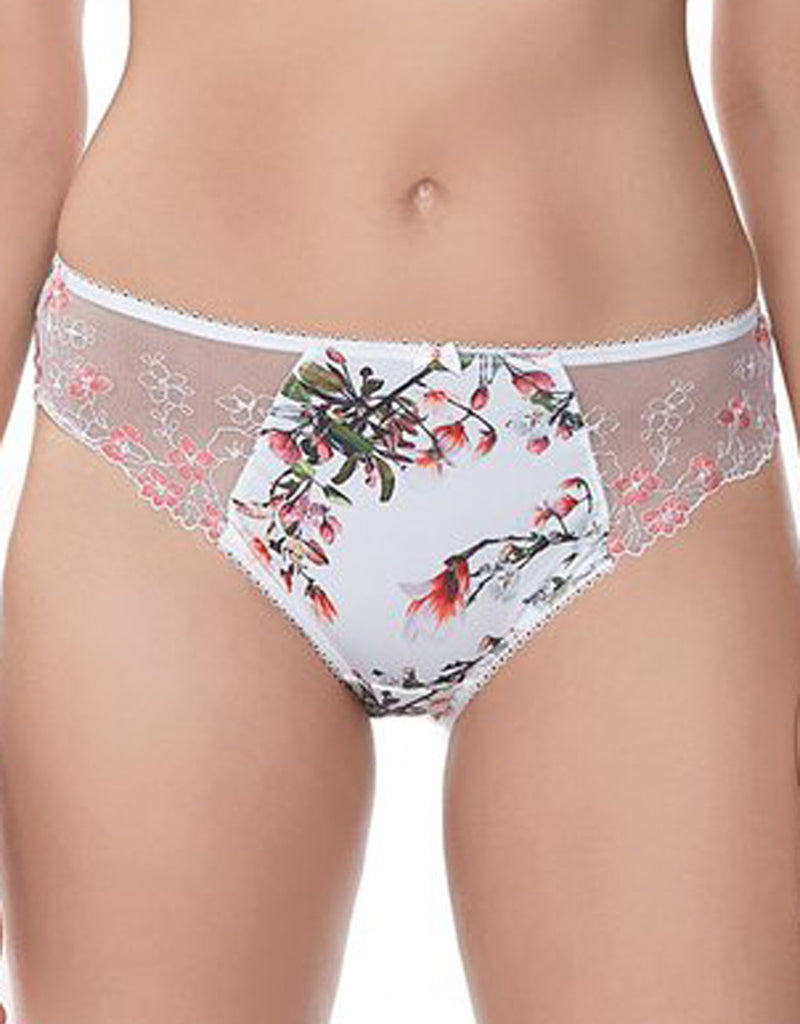 The Fantasie Kimberley Panties in White are romantic and sophisticated with the pink, white and green floral design to the centre and the semi opaque lace to the side panels at the front which has been adorned with a Swiss embroidery in pink and white. The Fantasie Kimberley Panties in white have the following features: