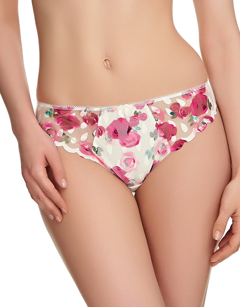 The Fantasie Rosanne Panties in Ivory are romantic and chic with the stunning combination of roses in red and pink with a ivory rain drop design on a ivory base. The front panel of the Panties has been lined with printed Swiss designed embroidery. The outer panels are semi opaque with a scalloped edging along the leg line.The look has been finished with a ivory bow detail and pearl drop detail to the centre. The Panties offers moderate rear coverage with a mid rise.