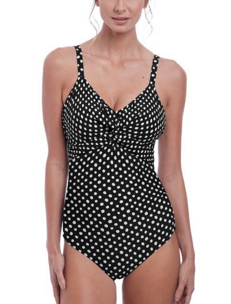 The Black and White Underwire Twist Front Suit-Light Control from Santa Monica, Fantasie is available in our signature black and white dot print pattern, which is playful yet classy and perfect for every occasion! This suit is sure to become your new go-to piece of swimwear!