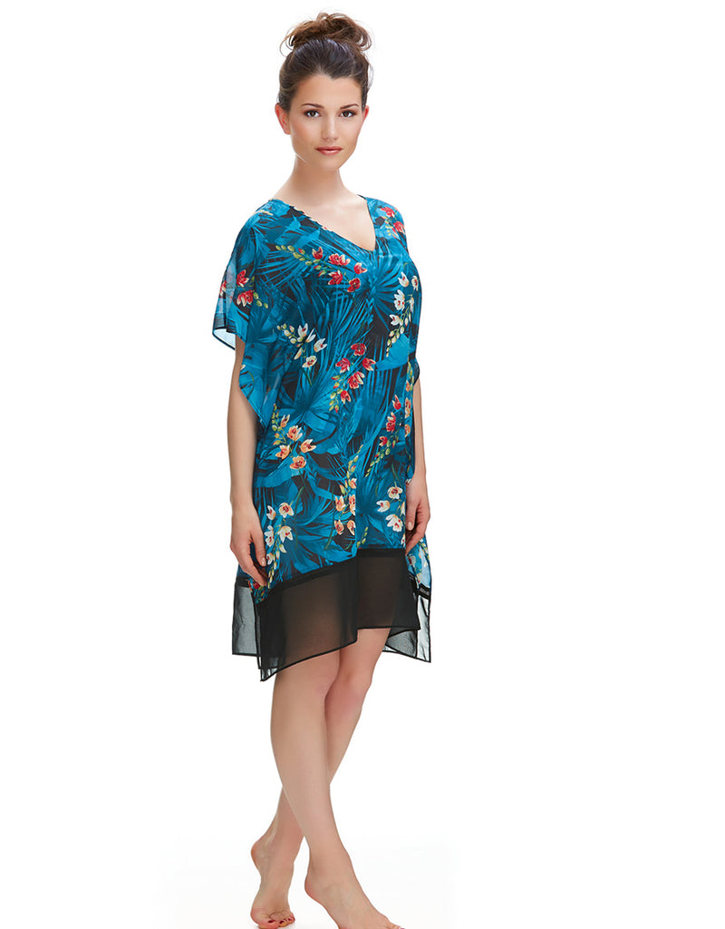 The Fantasie Seychelles Kaftan in Azure will take you on a tropical travel as far as your imagination will take you. The exclusively designed italian print blends azure blues, charming coral and intense fuchsia together against a black background. This mid length loose fitting kaftan will ensure you are look chic at all times. The semi sheer fabric is lightweight with the V neck finishing the look off. he Fantasie Seychelles Kaftan in Azure has the following features: