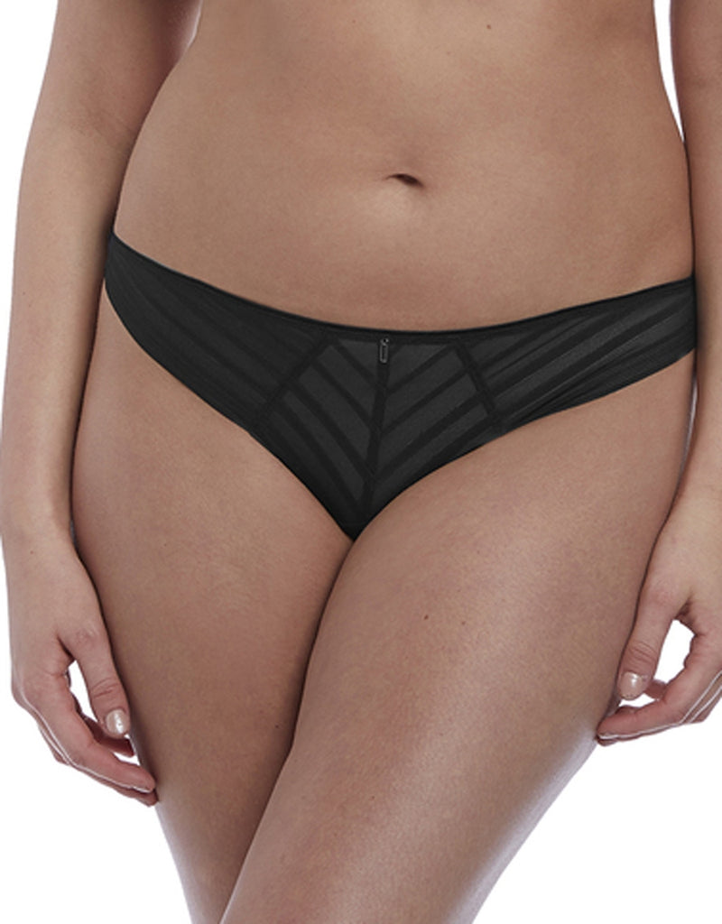 The Freya Cameo Brazilian in Black is stylish and beautiful in its design and look. The new Freya Cameo has a stunning striped design to the front and a smooth finish to the rear. The waist has a delicate trim to the edge and has been finished with a delicate silver color trim to the centre. The Brazilian is in a soft fabric which is ultra flattering and offer minimal rear coverage with a mid rise. The Brazilian ia available in sizes XS toXL.