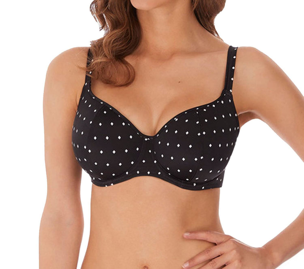 The Freya Jewel Cove Underwire Sweetheart Padded Bikini Top in Black has a gorgeous diamond print design, this bikini tops has lightly padded cups which give a lifted rounded shape. This bikini top has a sweetheart neckline which has been designed to enhance your cleavage, this bikini top has been finished with fully adjustable straps and a rear plastic snap fastening.