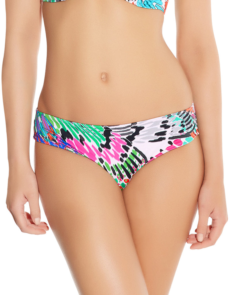 The Freya Mardi Gras Hipster Swim Brief crazes the carnival feel with vibrant colors of Pinks, Greens, Black and Grays across a crisp White base with a comfortable fit from the fully lined bottoms, mid-rise waistline and moderate rear coverage. The Mardi Gras has extra coverage with a hipster style giving a coverage like a Boyshort with higher side panels and a higher elasticated waistline.