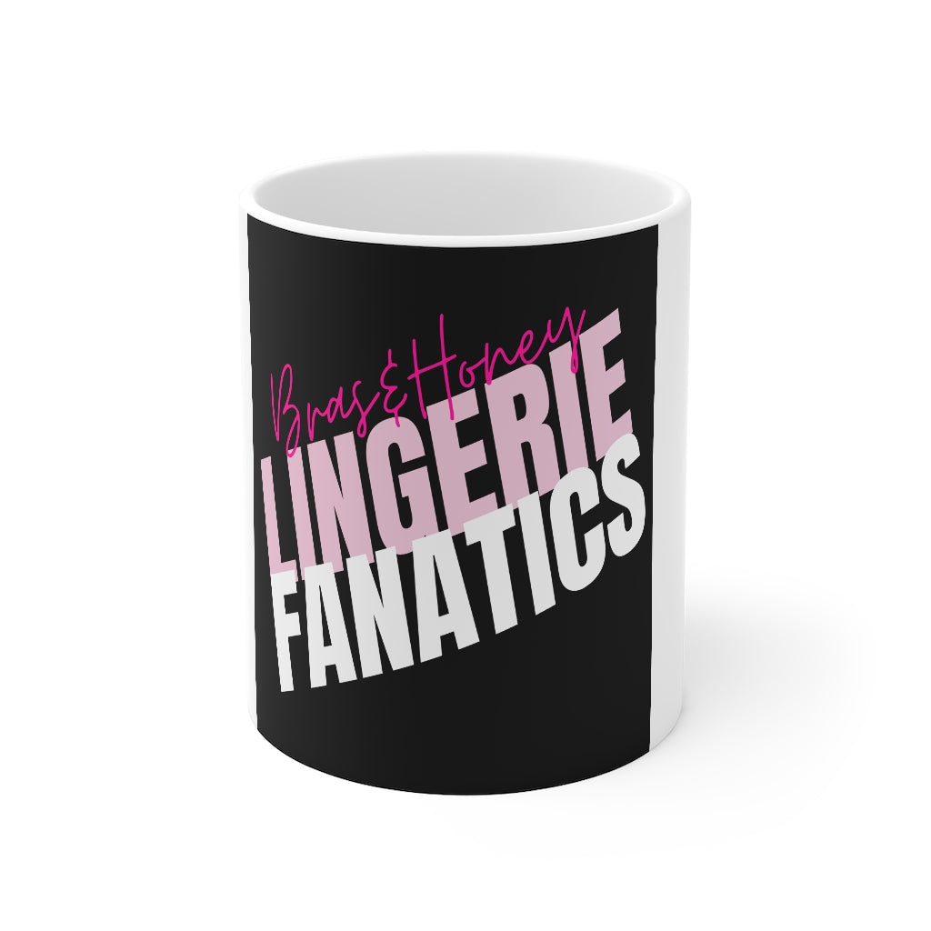 The Bras and Honey coffer mug is now available to all! This classic bestseller coffee mug with Bras&honey slogan 'Lingerie Fanatics' will hold your favorite beverage, while your relaxing and reading the newspaper. This custom mug is for those lingerie addicts that love bras and underwear and believe there can be nothing better than a cup of your favorite hot drink. The White coffee mug is made ofrom a white base color in durable ceramic and is enblazened with the loud white,black and pink slogan cups detailing. This coffe mus is sized to hold 11oz of your favorite hot drink. We have placed the eye-catching Lingerie fanatic design to make it the perfect gift for a friend or yourself and will also be a great gift idea for a coffee or tea lover.